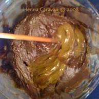 - Cho bột chàm vào một cái bát, thêm từ từ nước ấm có pha muối sẵn vào bột chàm và khuấy đều tay để tạo ra một hỗn hợp như hình bên phải. Nếu hỗn hợp còn khô thì cho thêm nước ấm từ từ vào và khuấy thành hỗn hợp có độ mịn như sữa chua.