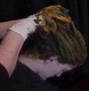 - Sau khi tóc nhuộm bằng bột lá móng đã được gội sạch bằng nước lạnh và sấy hơi khô, thực hiện pha chế bột chàm như trên phần hướng dẫn pha chế.