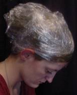 + Khi tất cả tóc của bạn được phủ đầy đủ hỗn hợp, hãy bọc nhựa quấn quanh đầu của bạn, làm sạch bột dính khỏi chân tóc trước trán và tai của bạn