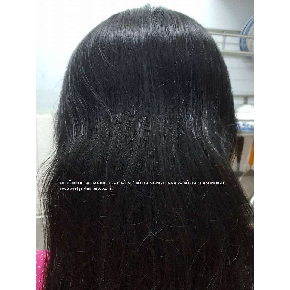 Khi nhuộm màu đen thì bạn không thể chỉ ủ bột chàm mà không ủ henna vì như thế sẽ cho ra mái tóc màu xanh đen chứ không phải màu đen.